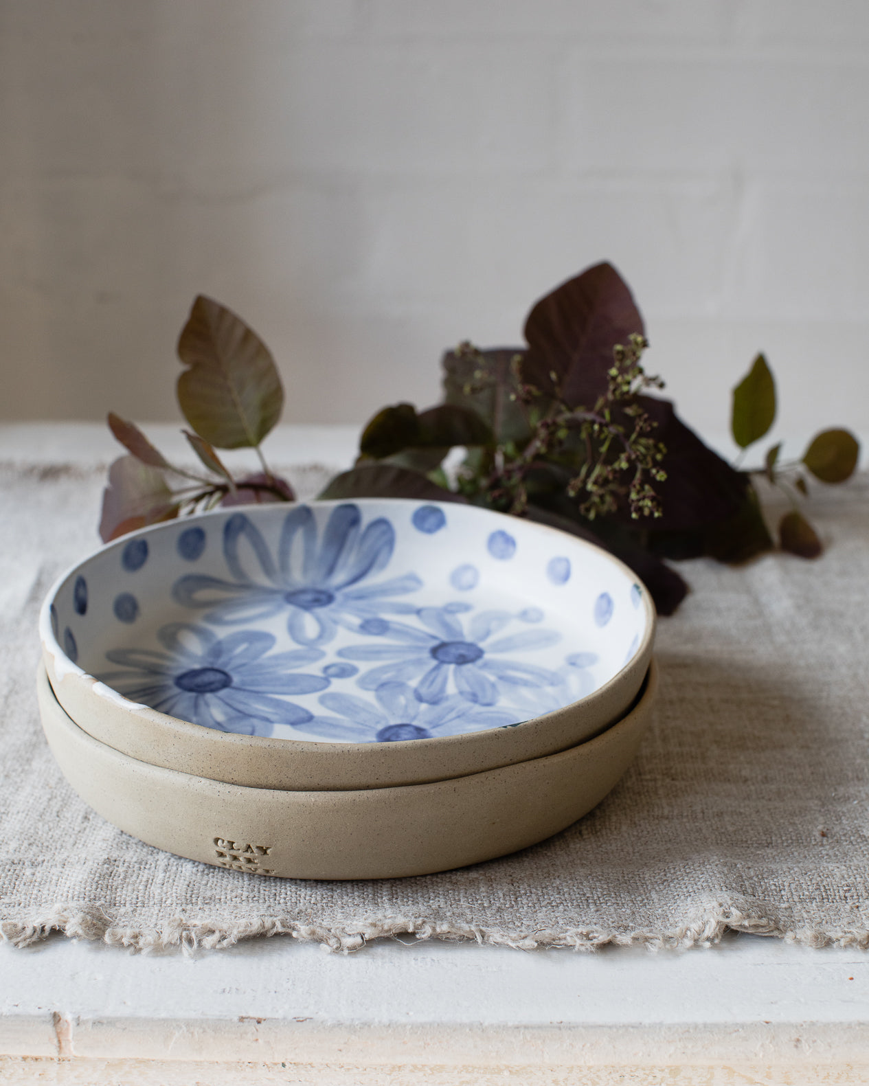 Large Blue & White flower plate with high rim Handmade from a beautifully rustic speckled...